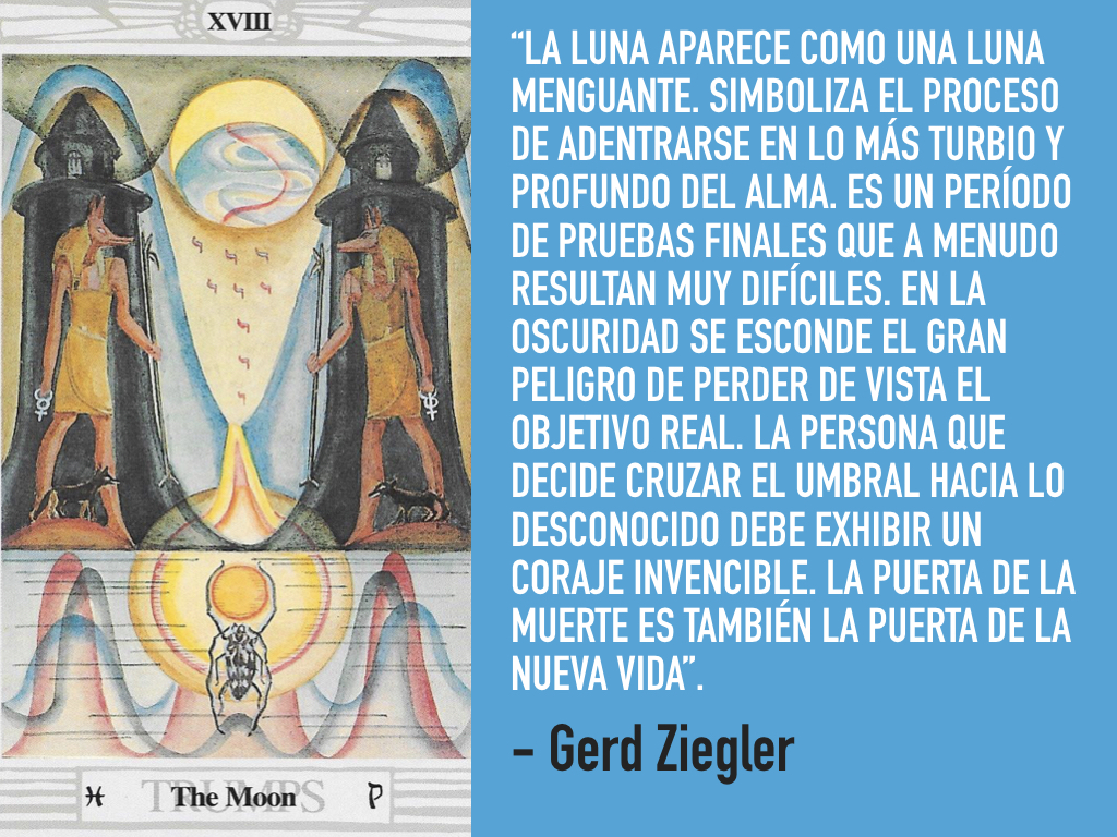 La Luna es uno de los arcanos más misteriosos del Tarot. Representa el inconsciente (con todos sus contenidos: sombra, arquetipos, complejos, energía psíquica, vivencias, imágenes, símbolos), el misterio, la intuición, el karma, la gran madre (que contiene o devora) convirtiéndose en una suerte de umbral a una prueba final.