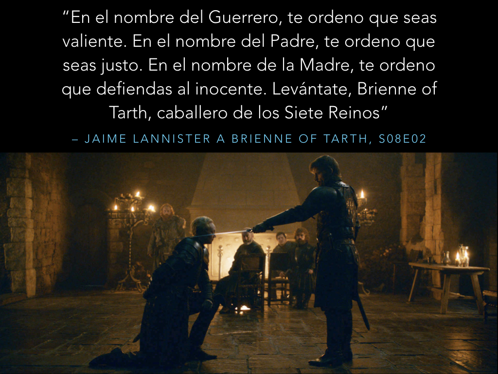 Brienne se pliega a las causas que defiende en cuerpo y alma, mostrándose valiente y fría, generando a veces el rechazo de los demás. Durante su viaje con #JaimeLannister a #KingsLanding hay un momento clave donde los dos terminan desnudos en un baño. Allí, sumergidos en el agua (símbolo de emoción), se abren y los conocemos realmente: una solutio que despoja a Brienne de su armadura (permitiéndonos ver su fragilidad) y a Jaime de su ego inflado (al enseñarnos su pasado).
