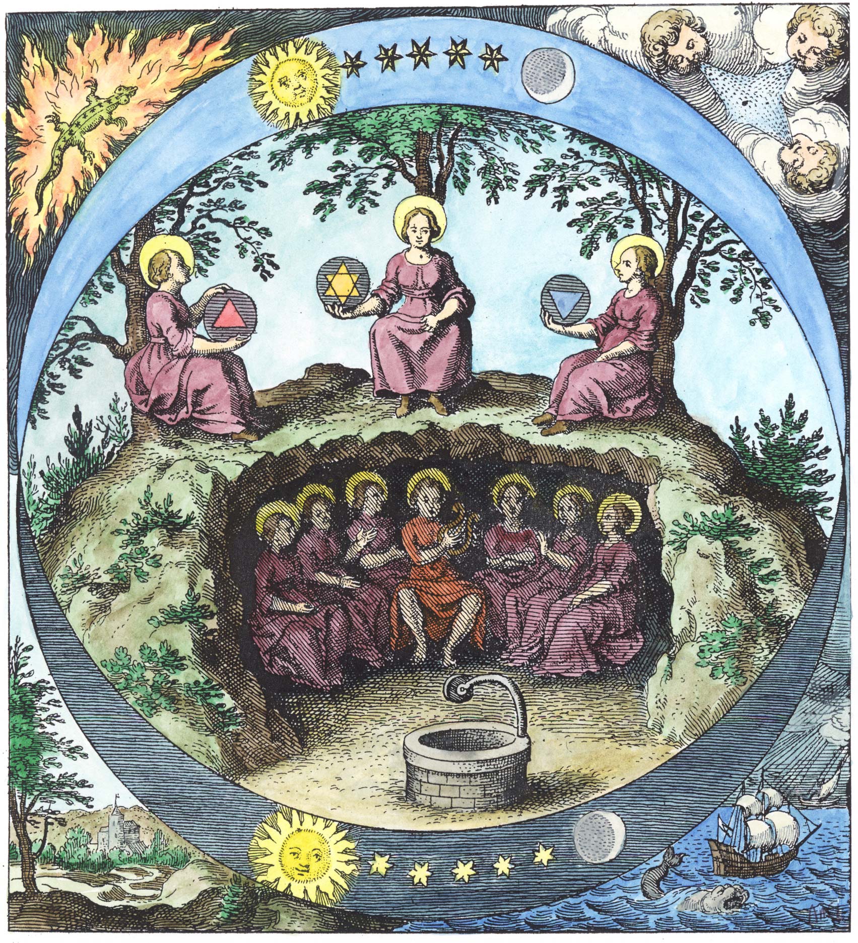 “Según una ley atribuida a Pitágoras, el espectro total de posibilidades de este mundo está contenido en la cifra cuatro. El quinto elemento aristotélico, la sutil “quintaesencia”, no puede encontrarse más que en el empíreo divino. El objetivo de los alquimistas era hacer descender ese elemento a la tierra mediante repetidas rotaciones, ya destilaran el espíritu del vino o imaginaran la luz divina en la sal. Para llegar a su realización, había que cruzar el anillo exterior del mundo inferior, el anillo ofídico de Saturno, que lo separa del paraíso. Saturno y el dios griego del tiempo, Cronos, son todo uno; su superación implica una cesura en el transcurso del tiempo, su retorno a la edad de oro, la eterna juventud en la simultaneidad divina” – Alexander Roob (Imagen: “Musaeum Hermeticum”).