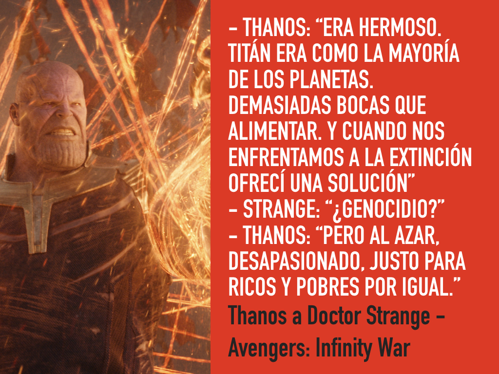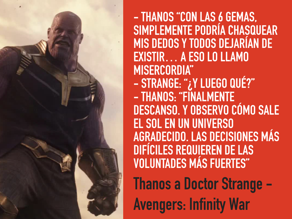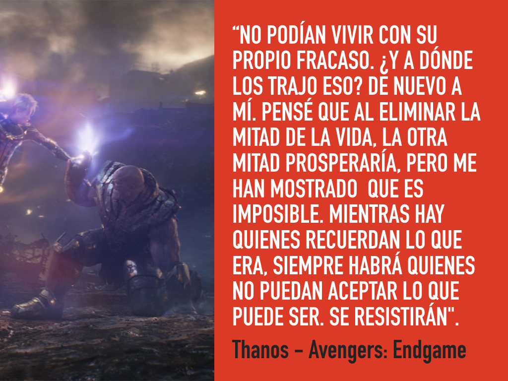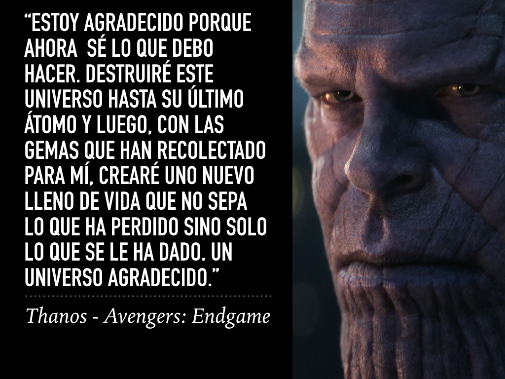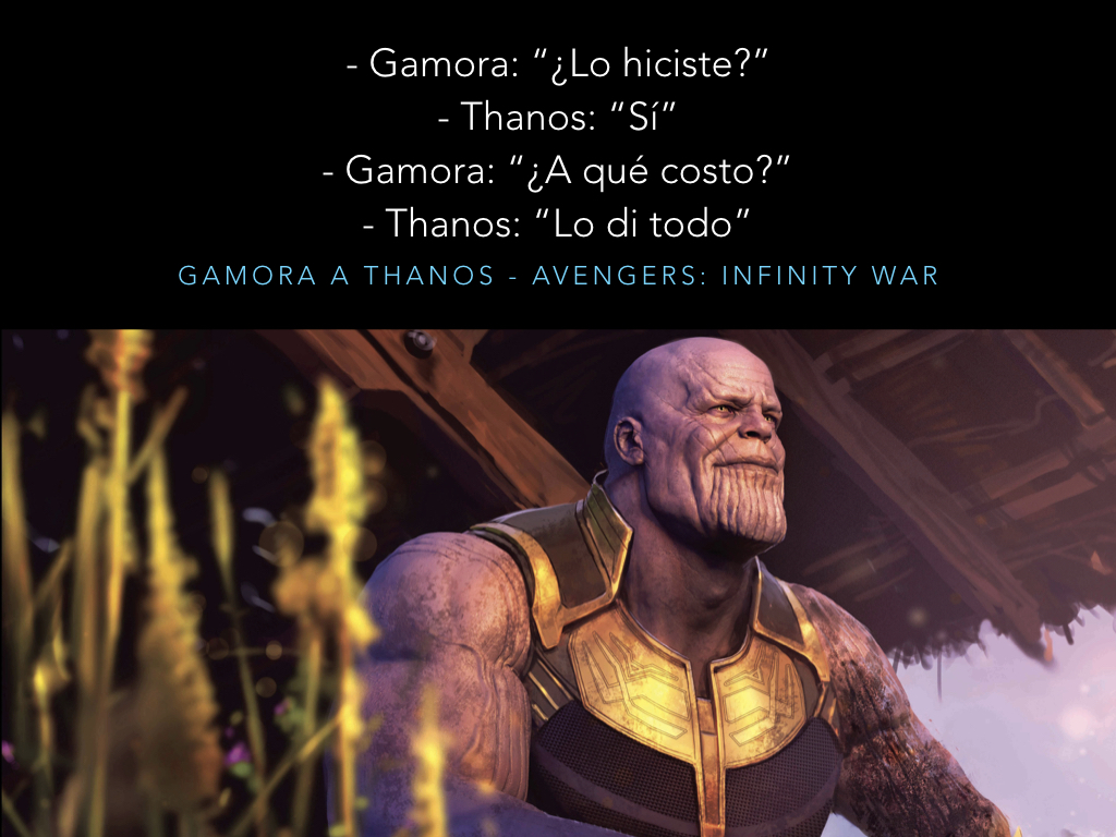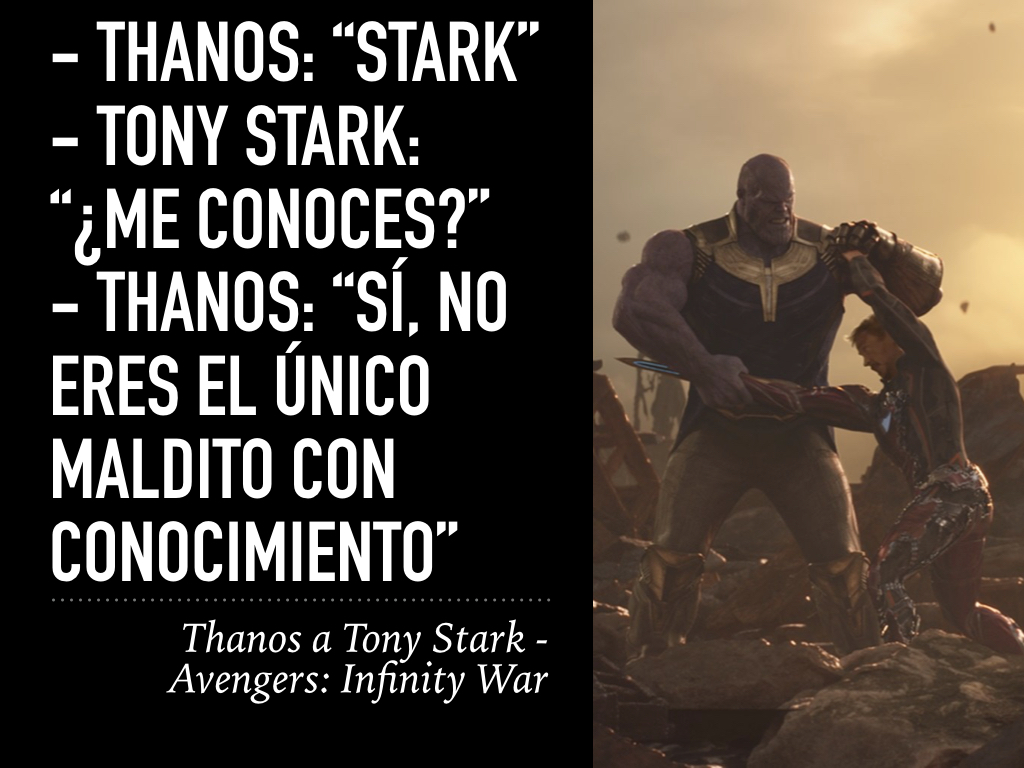 Al final, es derrotado por el factor humano y heroico que encarna #TonyStark que, desde su lado emocional, obtuvo la fuerza suficiente para hacerle frente, sacrificándose por el bien común y venciendo a la psicopatía de Thanos.